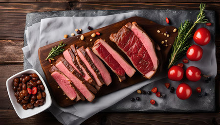 Sliced rare beef on a wooden cutting board, with fresh tomatoes, rosemary sprigs, and beans on the side, set against a wooden background.