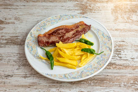 Beef entrecote on a plate with fried potatoes and padron peppers