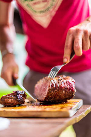 Sliced grilled steak medium rare served on wooden cutting board with vegetables. Delicious juicy meat in the restaurant menu. concept of catering