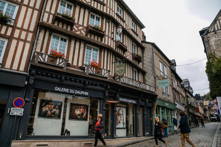 Historic half-timbered buildings at narrow picturesque back street, Honfleur, Normandy, France, September 25, 2019