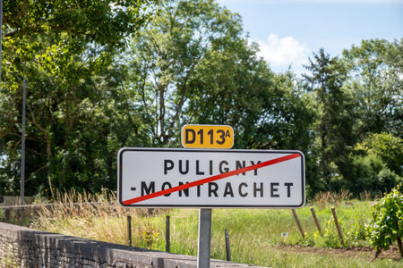 Road sign Puligny-Montrachet village, wine of Burgundy France. High quality white dry wine making from Chardonnay grapes on grand cru classe vineyards and clos