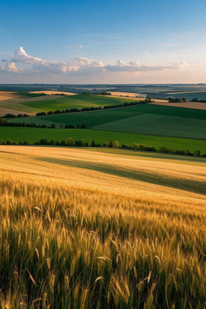 Breathtaking view of lush green crop fields spreading over rolling hills. Explore the beauty of nature with vibrant patterns and a serene countryside atmosphere.