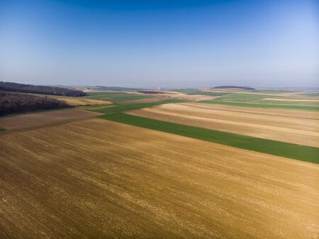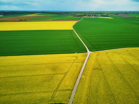 Scenic aerial drone view of yellow rapeseed fields in Ile-de-France, France