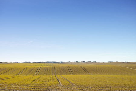 Cultivated land under a clear sky. A cultivated stretch of land on a farm.