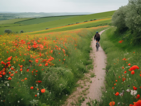 A person riding a bike down a country road with red poppies along the sides. AI generative image.