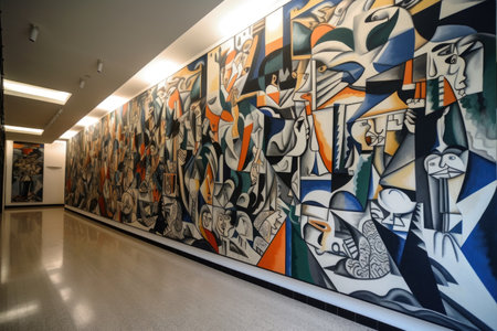 cubism-inspired mural on the walls of museum, depicting the history of art, created with generative ai