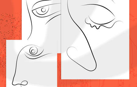 A set of creative templates in a fashionable style with a portrait in one line, modern abstract colorful shapes.Design for home and office decor.