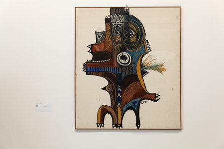 Venice, Italy - April 19, 2024: The painting of Bertina Lopes titled Totem exposed at the Central Pavilion during the 60th International Art exhibition of Venice biennale 2024, titled Foreigners Everywhere curated by Adriano Pedrosa