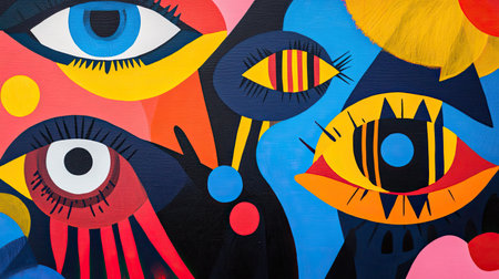 This captivating artwork features vibrant eyes and dynamic shapes, presenting a unique blend of colors and patterns that evoke modern artistic expression.