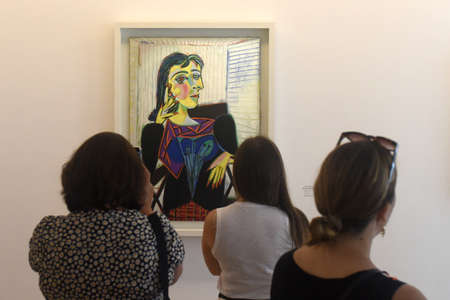 Paris, France - August 27, 2019: Visitors near the Portrait of Dora Maar 1937 by Pablo Picasso painting in Picasso Museum in Paris.