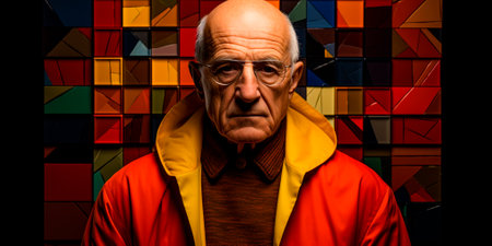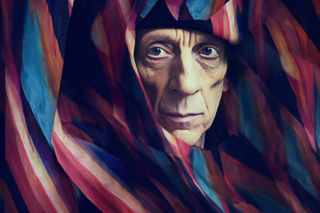Portrait of an elderly man with a colorful scarf on his head