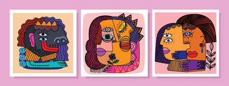 Set of abstract face people portrait geometric, doodle, decorative, line art hand drawn vector illustration. Aesthetic design for art print, wall art, poster, cover, cards and back