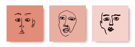 set of three arts with abstract faces in beige colors. Hand-drawn lines, simple shapes. Portrait line-art minimalist minimalistic elegant style. Design for wall decor, cover print. Vector illustration
