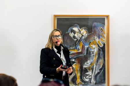30.10.2021. Malaga, Spain. blond girl standing in front of Pablo Picassos one of the most famous painting called Les Demoiselles dAvignon in Picasso Musseum in Malaga. High quality photo