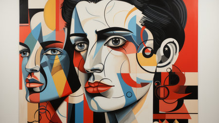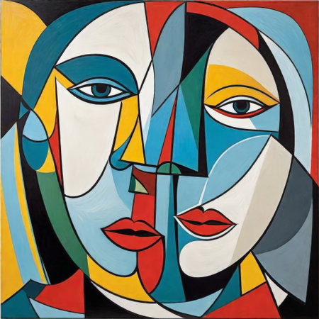 Abstract cubist painting of man and woman kissing with geometric shapes and bold lines, artistic modern surrealism portrait art.