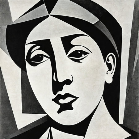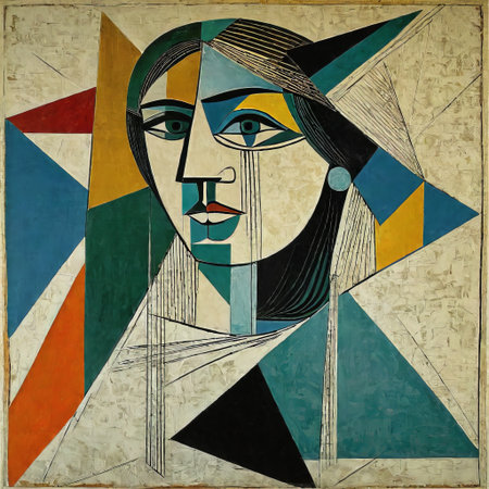cubist portrait of woman, with her face and body fragmented into geometric shapes, created with generative ai