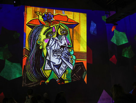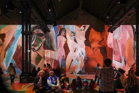 Paris, France - March 19, 2025: Atelier des Lumières a place of digital art in an old factory in Paris, present a immersive exhibition: Pablo Picasso, art in motion
