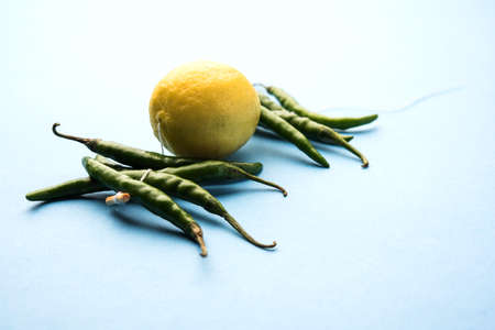 lemon chilies hanging - Indian superstitious lemon and green chillies tied with thread and tied on doors at home or shop to avoid any bad fortune also known as totka or nazar battu