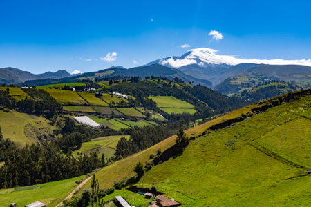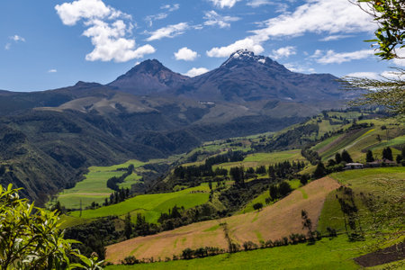 Ilinizas Volcano, Andean landscape with its crop fields and mountains showing their greenery on a clear morning, south eastern view.
