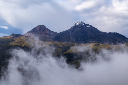 Beautiful view of the snow caped Illinizas volcano, in the Ecuadorian Andes, on a sunny and overcast morning