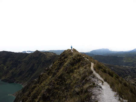 Young hiker standing on andean volcano caldera crater lake Quilotoa rim ridge loop in Pujili Cotopaxi Ecuador andes South America