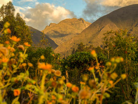 The Iguaque mountain at sunset, beahind some erato vulcanica flowers, near the town of Villa de Leyva in central Colombia.