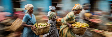 Women in vibrant clothes hustle through a busy market, expertly balancing baskets of fresh fruit as they navigate the lively streets.