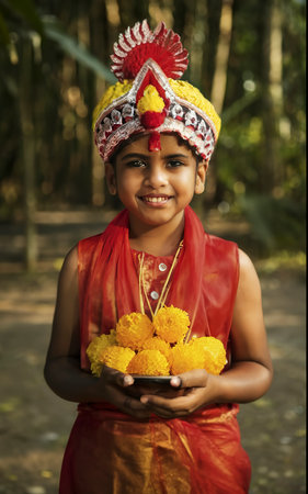 Two smiling Indian boys in vibrant orange traditional outfits adorned with marigold garlands, celebrating cultural festivities with joyful expressions