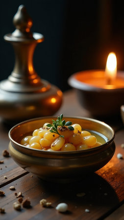 Traditional Indian dessert in brass bowl with candlelight ambiance.