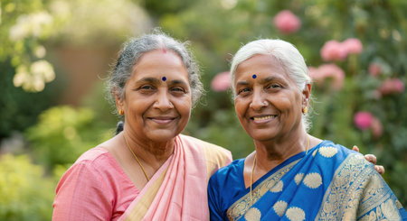 Elderly south asian women in traditional attire embracing joy in a garden setting