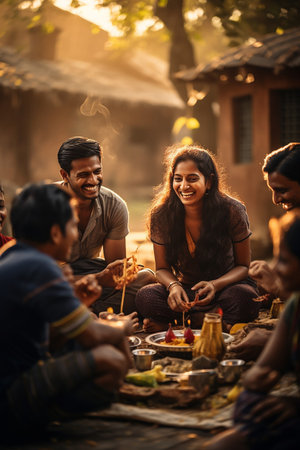 Teenage indian girls gathered around the festival food, celebrating Lohri