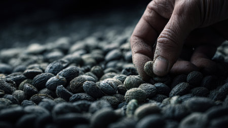 A hand carefully picks out a seed from a large pile of rough-surfaced seeds, highlighting the intricate details in a softly lit environment.