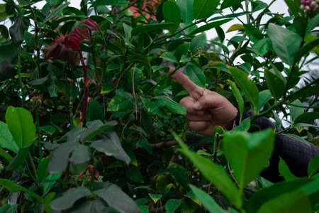 Man finger is pointing out the corner in the green leaves and branches of trees. Unique showing idea.