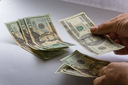 POV (Point of view) of young adult Australian man hands counting cash of Federal Reserve Notes close up.