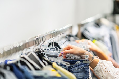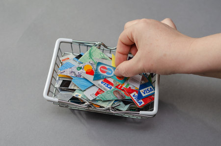 A woman's hand extracts a piece of a bank card from a shopping cart. Metal shopping cart full of cut credit cards from various banks against a gray background. Kiev, Ukraine - 01 05 2022.