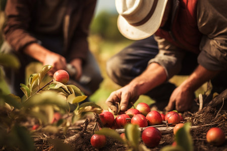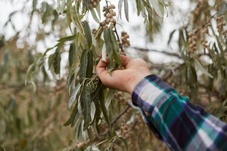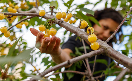 hand man plucks cherries, berries, orchard, harvestingwith sunny hotspot