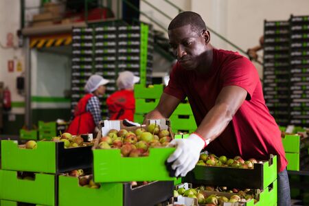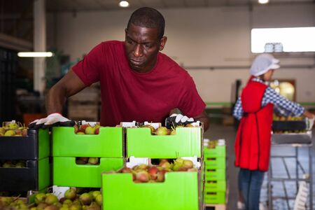 Positive African American workman working in fruits sorting department, stacking boxes with harvested pears