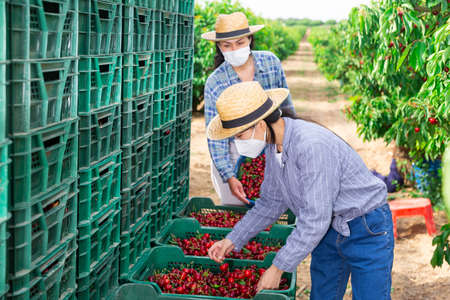 Seasonal farm worker hanged a full basket of sweet black lapins cherries on his neck. Cherry harvest in the organic orchard