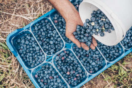 Woman picking blueberries, close-up of hands and berries growing on the bushes, seasonal blueberry harvest.