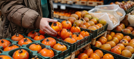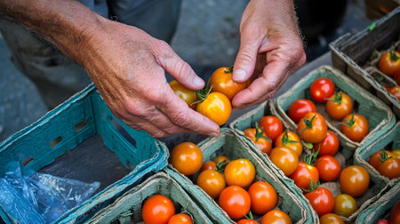A person inspects ripe tomatoes, choosing the best ones from a colorful market stall.