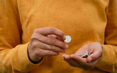 Russian woman considers savings cash. Only mans hands and money, yellow clothes. Concept of poor human. Russian coins hold in hands and count. Crisis and economic downturn.