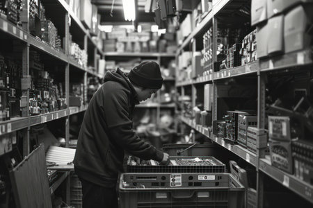 A candid shot of a worker inspecting a crate of electrical parts, surrounded by shelves filled with other components, emphasizing quality control. --ar 3:2 --v 6 Job ID: 495678ca-4d6e-4e2e-a2ab-690a96f8ebd9