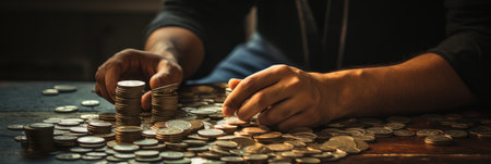 A Person Stacking Coins On Top Of A Table. Coin Stacking, Mental Focus, Balance, Creativity, Dexterity, Patience, Handeye Coordination, Money Management.