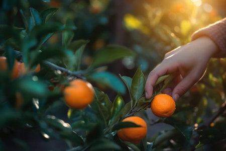 Close up of gardener hand picking an orange with scissor in the oranges field garden in the morning time.