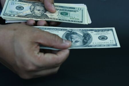 Folding money into piles on a black background. Close-up. A man carefully puts money in piles on a black background. A lot of money in packed bundles.