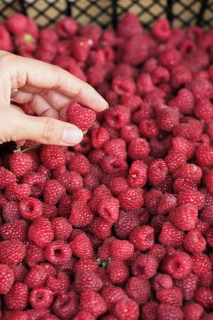 raspberries in the hands. Choose raspberries in the market. Raspberries on a market counter. close-up