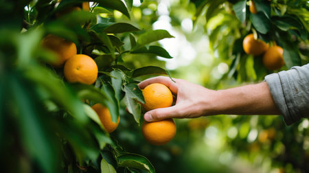 A farmer hand picking a ripe, yellow plum from a tree branch in the garden, farm land. A hand reaching for a yellow fruit growing on a tree branch among green leaves. Fruit cultivation and harvesting.