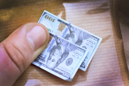 two banknotes in the amount of 100 in miniature, against the background of a paper packer, a joke, a deception, a scope.
