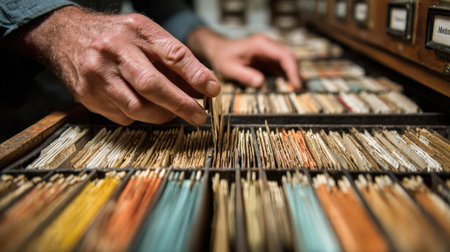 A person standing in a store is looking at a display of CDs featuring various genres and artists, A hand reaching out to pick a Valentine's Day card from a rack, AI Generated