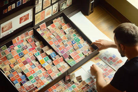 A man carefully organizes a large collection of colorful vintage stamps on a wooden table in a bright room.